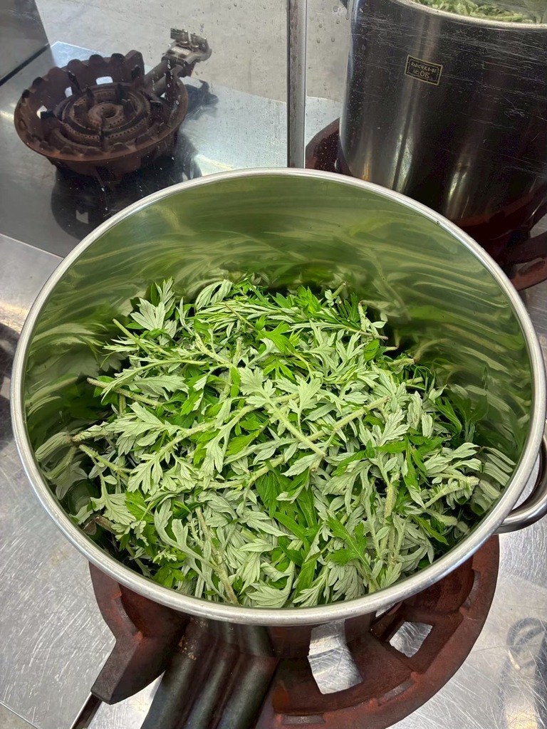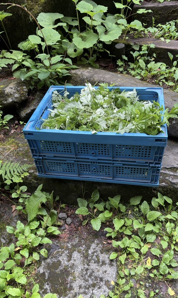 摘みたてが一番良いということで、前日に畑で”ヨモギ”を採取し、カゴいっぱいにして当日絹工房へ!