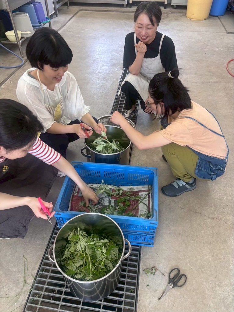 初心者向けなので、色々とお話ししていく中で、良く染まる、まだ山では旬の畑にもある”ヨモギ”で染めましょうということになりました。