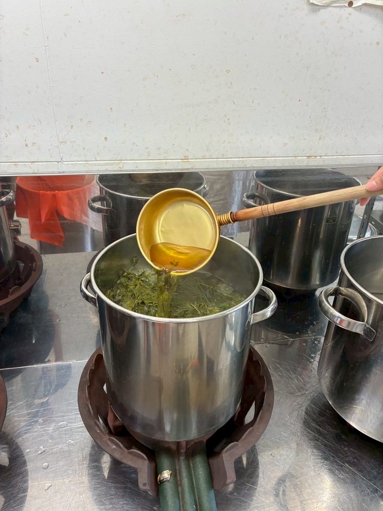まずは、取ってきたヨモギをハサミでカットし寸胴へ。