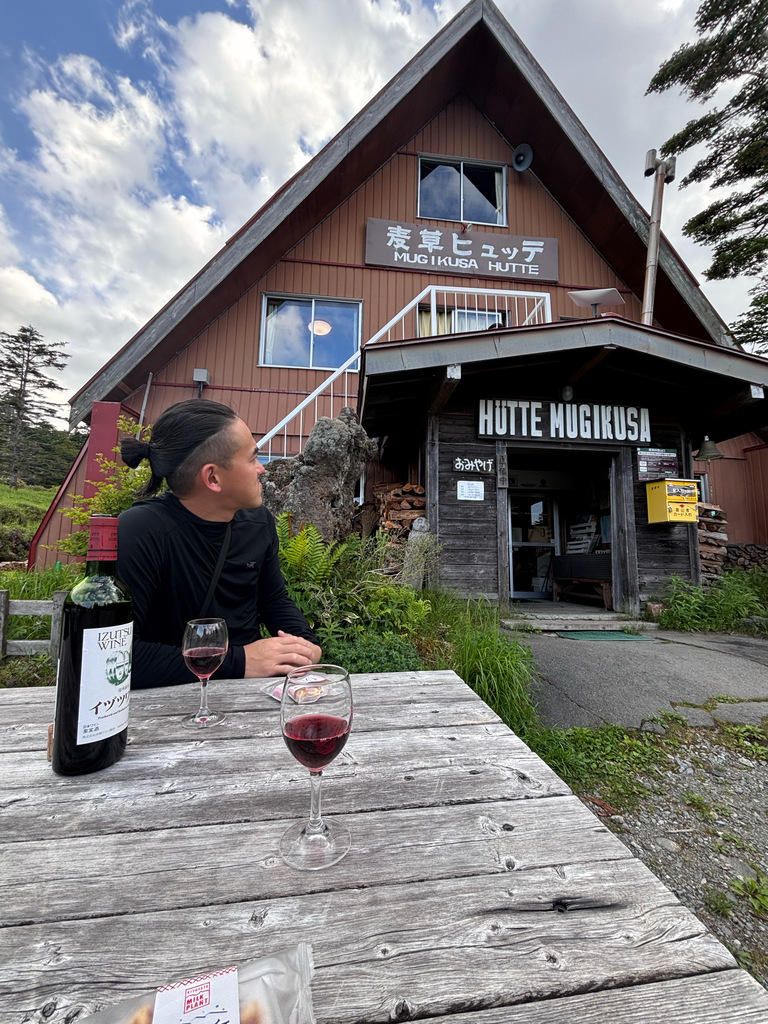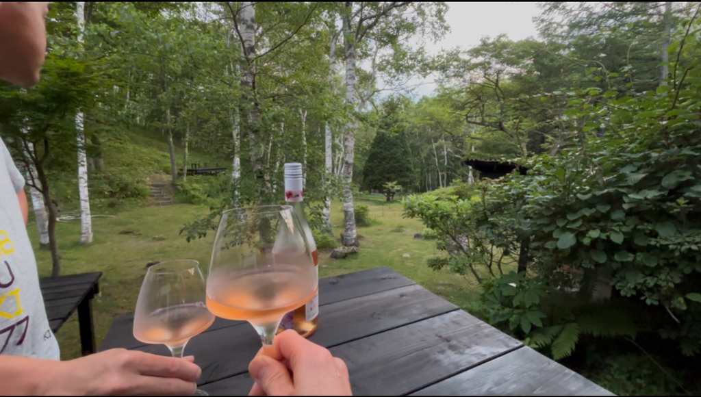 お風呂をいただき、夕食まで1時間ほどあるので外でワインをいただきました。