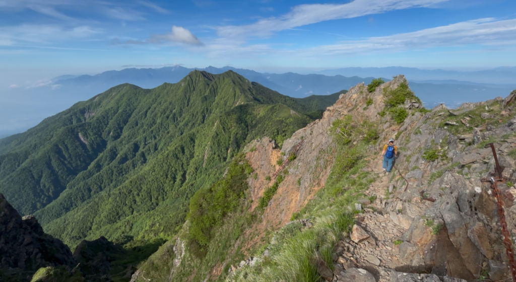 難関であろうキレット(山の尾根がV字に深く切り落ちている場所)に向かいます。